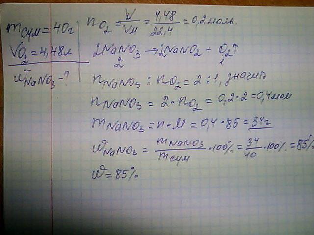 внаслідок нагрівання 40г суміші, яка містить нітрат натрію, добуто кисень об'ємом 4,48л(н.у.). Масова частка NaNO3 у вихідній суміші становить.