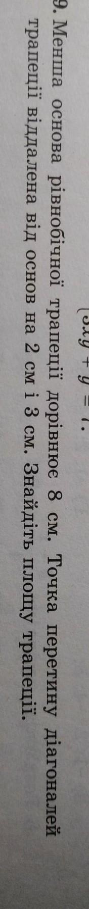 трапеції віддалена від основ на 2 см і 3 см. Знайдіть площу трапеції.