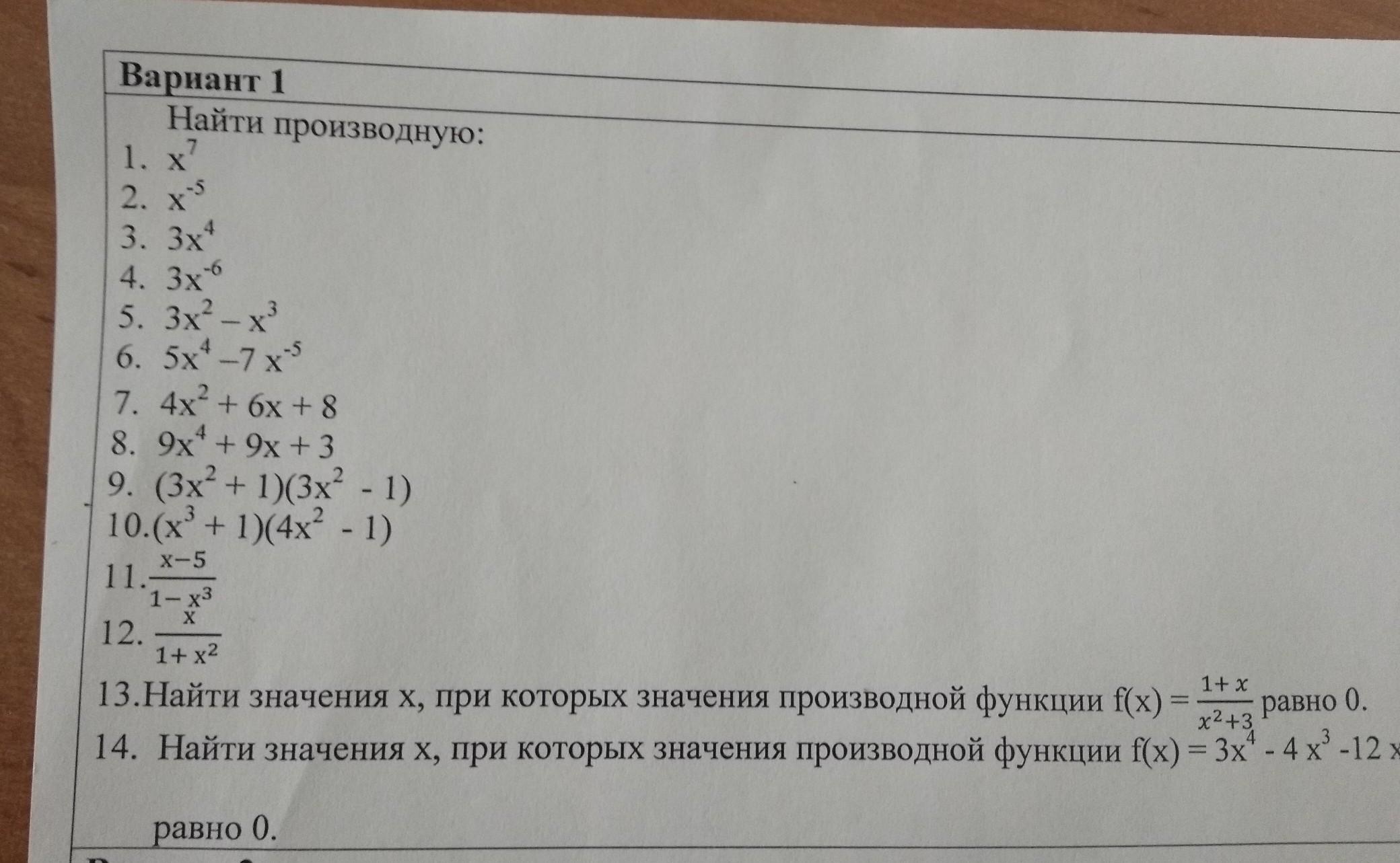 1. 7х⁶; 2. -5/х⁶; 3. 12/х³; 4. -18/х⁷; 5. 6х-3х²; 6. 20х³-35/х⁶; 7. 8х+6; 8. 36х³+9; 9. 6х*(3х²-1)+6х*(3х²+1)=6х*6х²=36х³; 10. 3х²*(4х²-1)+8х*(х³+1)=12х⁴-3х²+8х⁴+8х=22х⁴-3х²+8х; 11. (1-4х³+15х²)/(1-х³)²; 12. (1-х²)/(1+х²)²; 13. х=-3;х=1