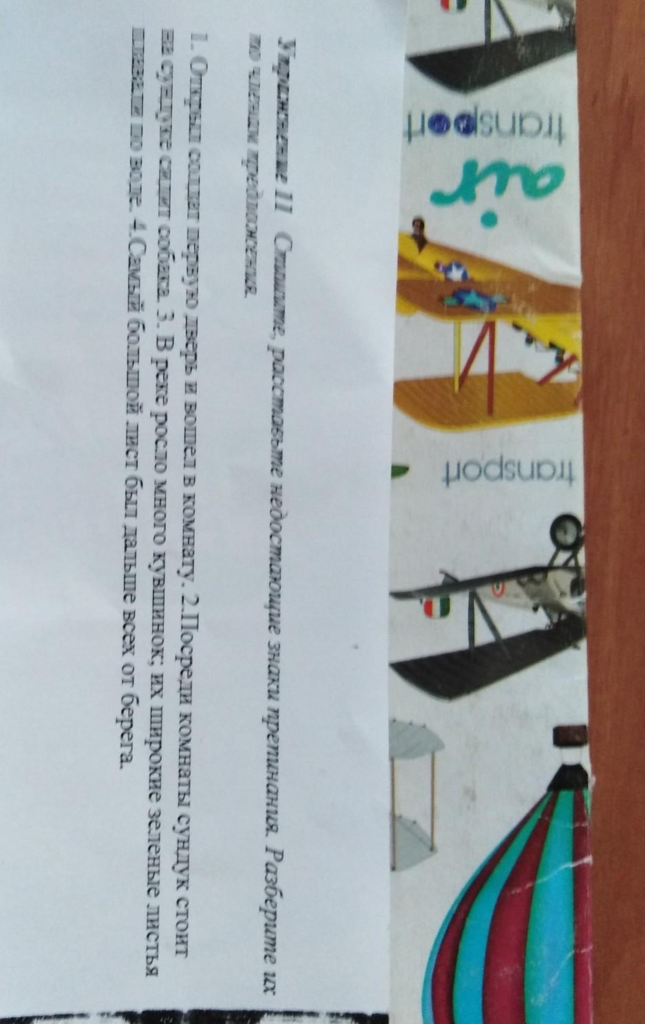 1.Открыл солдат первую дверь, и вошёл в комнату. 2. Посреди комнаты сундук стоит, на сундуке, сидит собака. 3.В реке росло много кувшинок; их широкие, зелёные листья плавают по воде. 4. Самый большой лист, был дальше от берега.