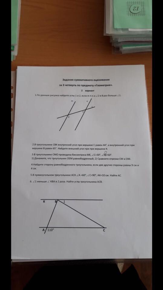 уА=уВАС=180-110=70° как смежные, уКВА=уА =70° ,-соответственные при секущей АВ, уАВС=180-70-70/2= 75°, уС=180-70-75=35°