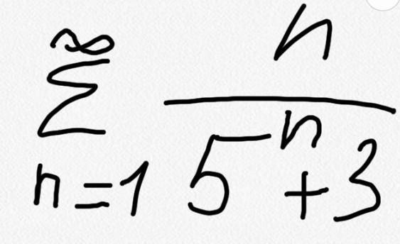 sum limits _{n=1}^{infty }frac{n}{5^{n}+3}\\limlimits _{n to infty}frac{a_{n+1}}{a_{n}}=limlimits _{nto infty }frac{n+1}{5^{n+1}+3}:frac{n}{5^{n}+3}=limlimits _{n to infty}frac{5^{n}+3}{5^{n}cdot 5+3}=[; Lopital; ]=\\=limlimits _{nto infty }frac{5^{n}cdot ln5}{5cdot 5^{n}cdot ln5}=frac{1}{5}<1; ; to ; ; sxoditsya