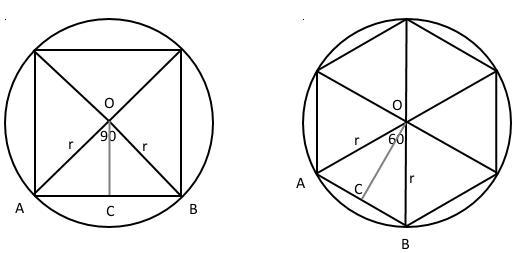 Чертим квадрат и шестиугольник, у обоих надо найти сторону AB, там получаются равнобедренные треугольники AOB, потому что AO и OB - радиусы r, у квадрата ∠AOB = 90°, потому что 360° всей окружности делятся на 4 равные части, у шестиугольника аналогично ∠AOB = 60°. Раз треугольники равнобедренные, то высоты OC делят являются медианами и биссектриссами углов AOB. Найдем AC у квадрата: r sin 45° = r √2/2; у шестиугольника: r sin 30° = r/2. Ну и отношение соответственно (r√2/2)/(r/2) = √2.