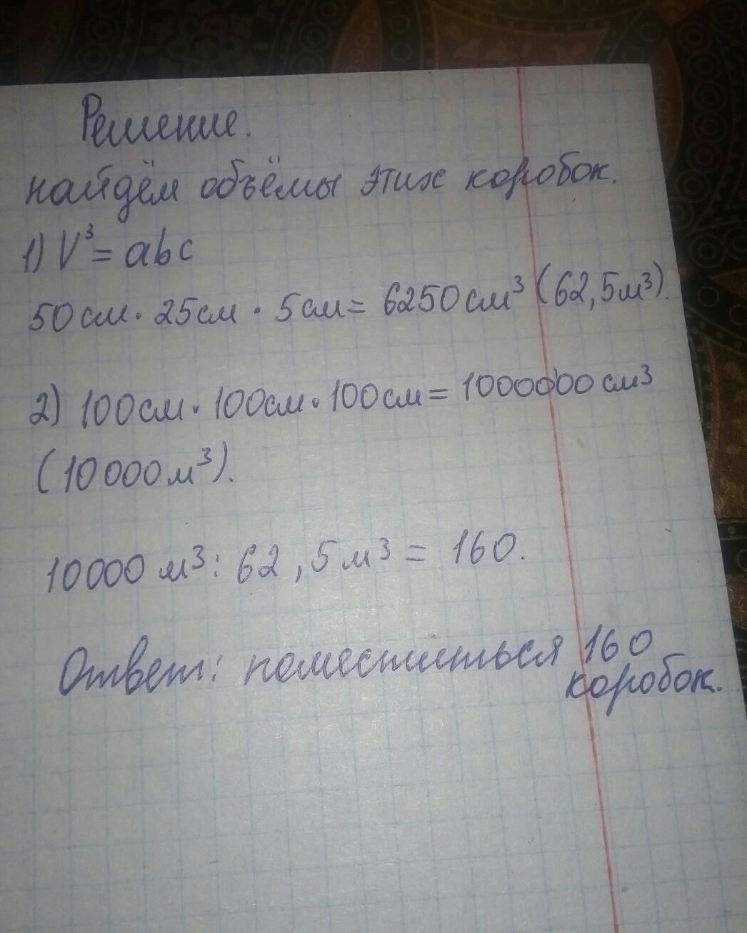 Коробка конфет имеет длину 50см, ширину 25см и высоту 5см. Сколько таких коробок влезет в кубический ящик, у которого длина, ширина и высота равны 1м?