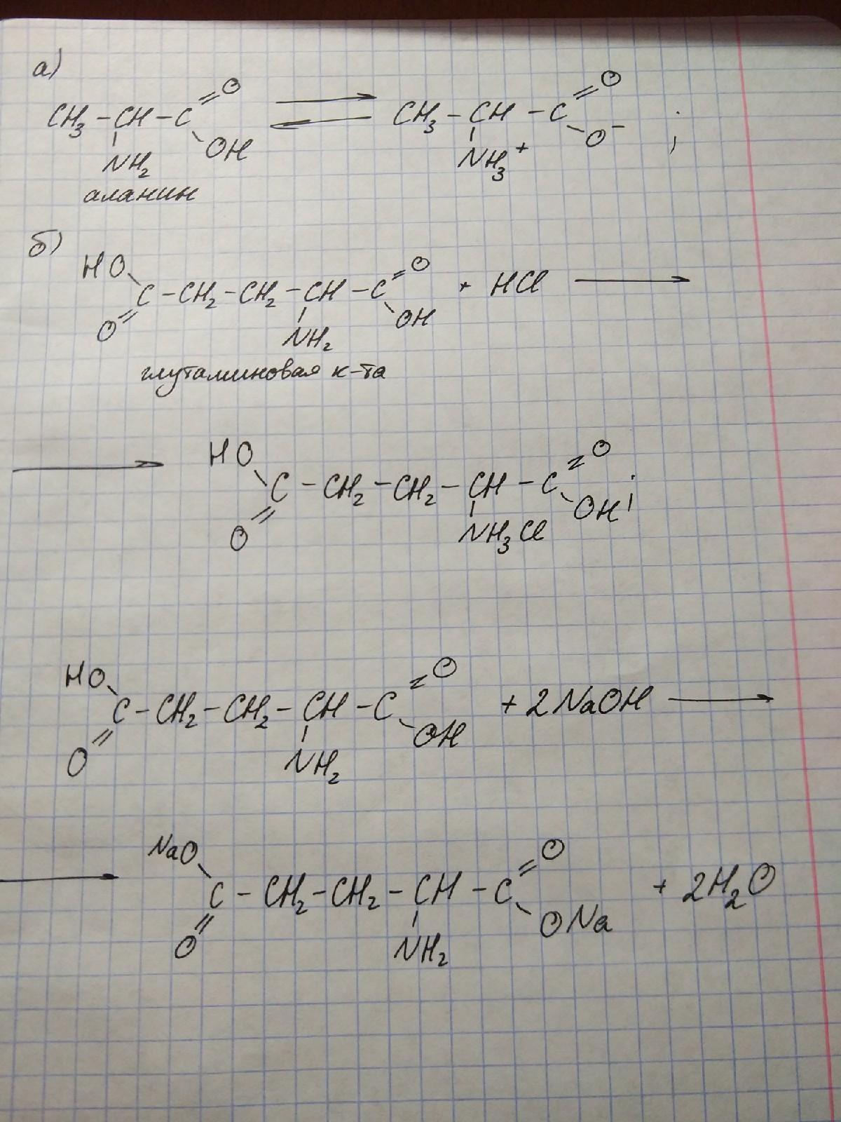 Амфотерные свойства аминокислот. Напишите уравнения реакций: а) образования внутренних солей аланина; б) реакции взаимодействия глутаминовой кислоты с NaOH и НСl.