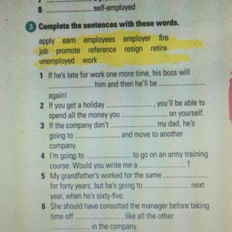 1 fire … unemployed 2 job … earn 3 promote …. resign 4 apply … reference 5 employer …retire 6 work … employees