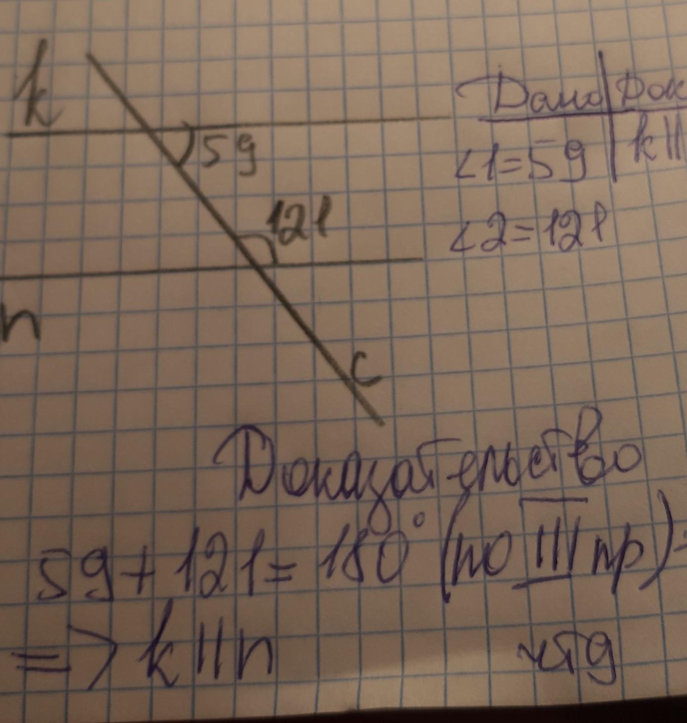 Помогите, пожалуйста, решить. Рисунка нет. Дано: к и н - прямые, с - секущая. Угол 1 равен 59 градусов угол 2 равен 121. Доказать, что к параллельна н