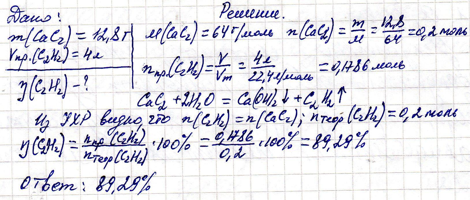 При взаимодействии 12,8 г карбида кальция (СаС2) с водой получили 4 л ацетилена. Определите процентный выход продукта реакции.