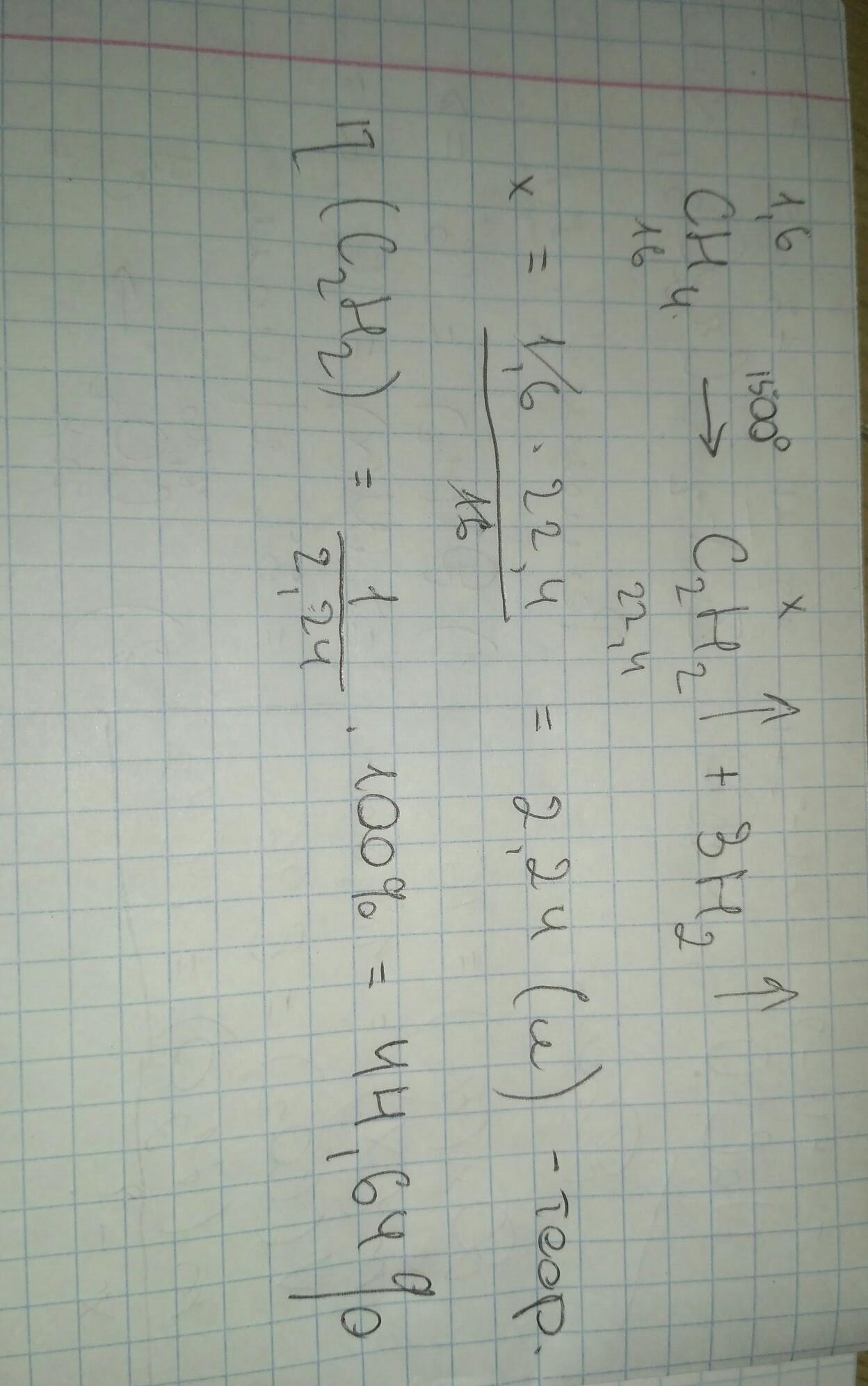 При разложении 1,6 г метана получили 1 л ацетилена. Определите процентный выход продукта реакции.