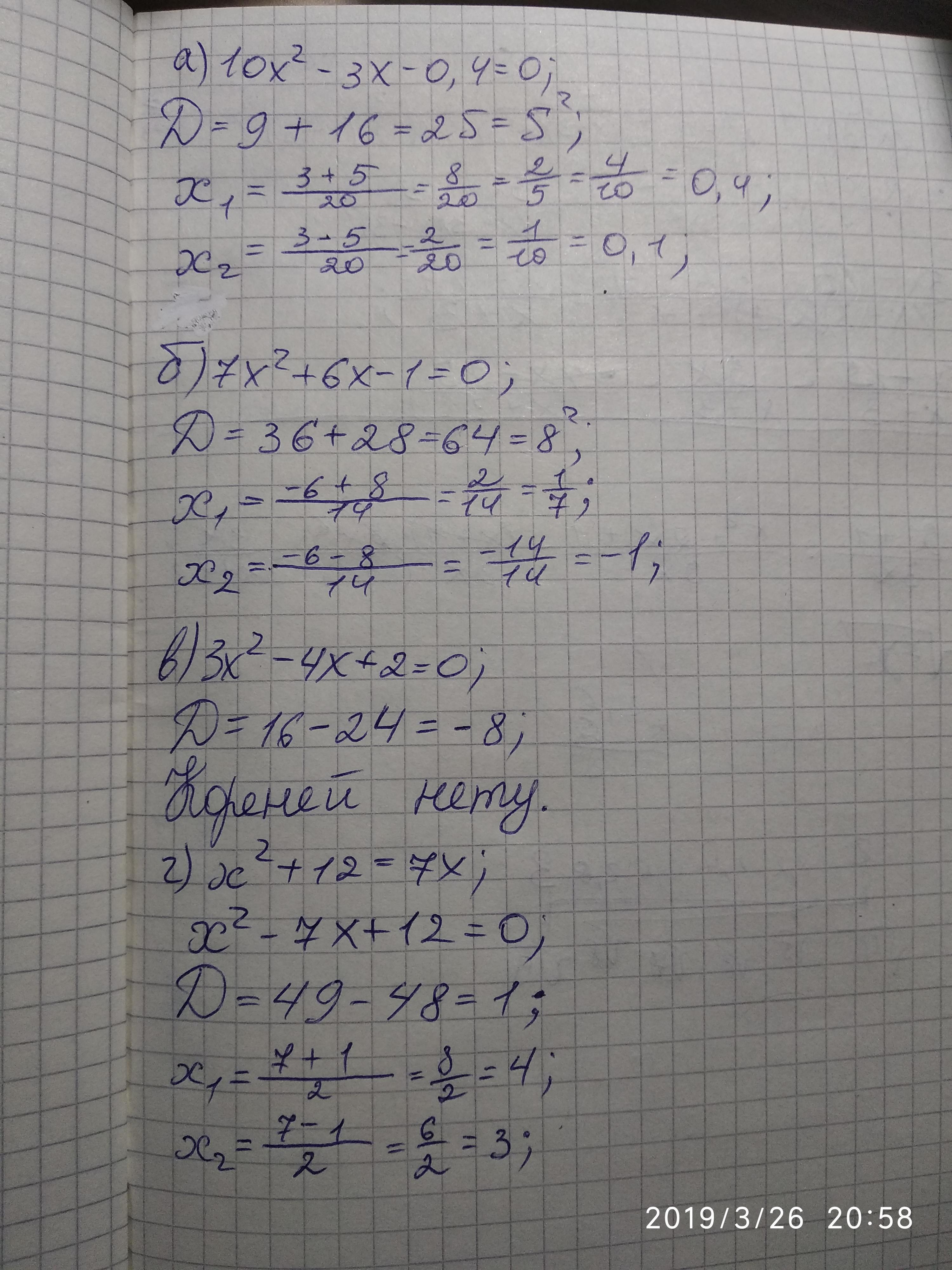 а)10x²-3x-0,4=0 г)x²+12=7x