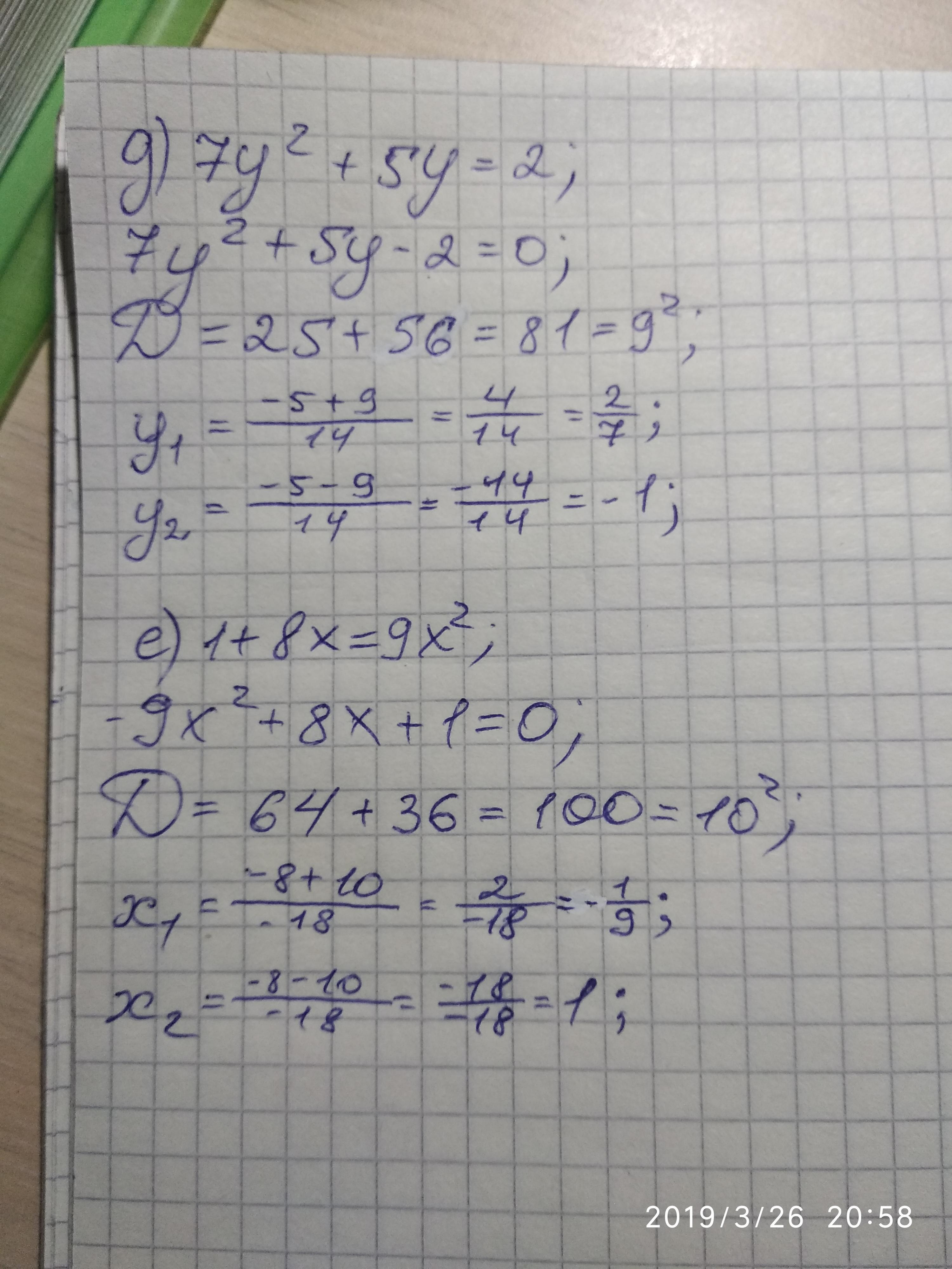 б)7x²+6x-1=0 д)7y²+5y=2