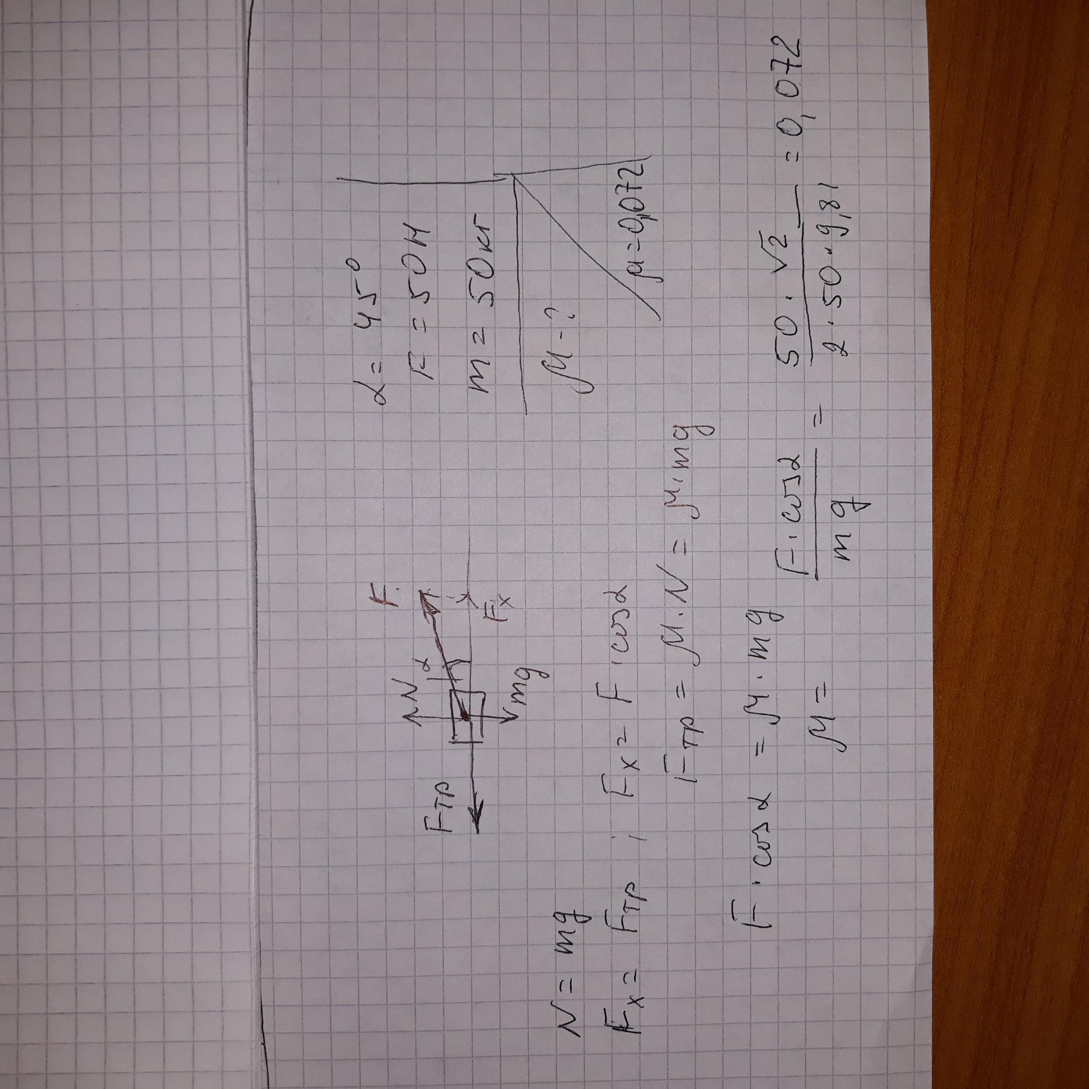мальчик равномерно тянет санки массой 50 кг, прикладывая к веревке силу 50 Н под углом 45 градусов к горизонту. Определите коэффициент трения санок об дорогу