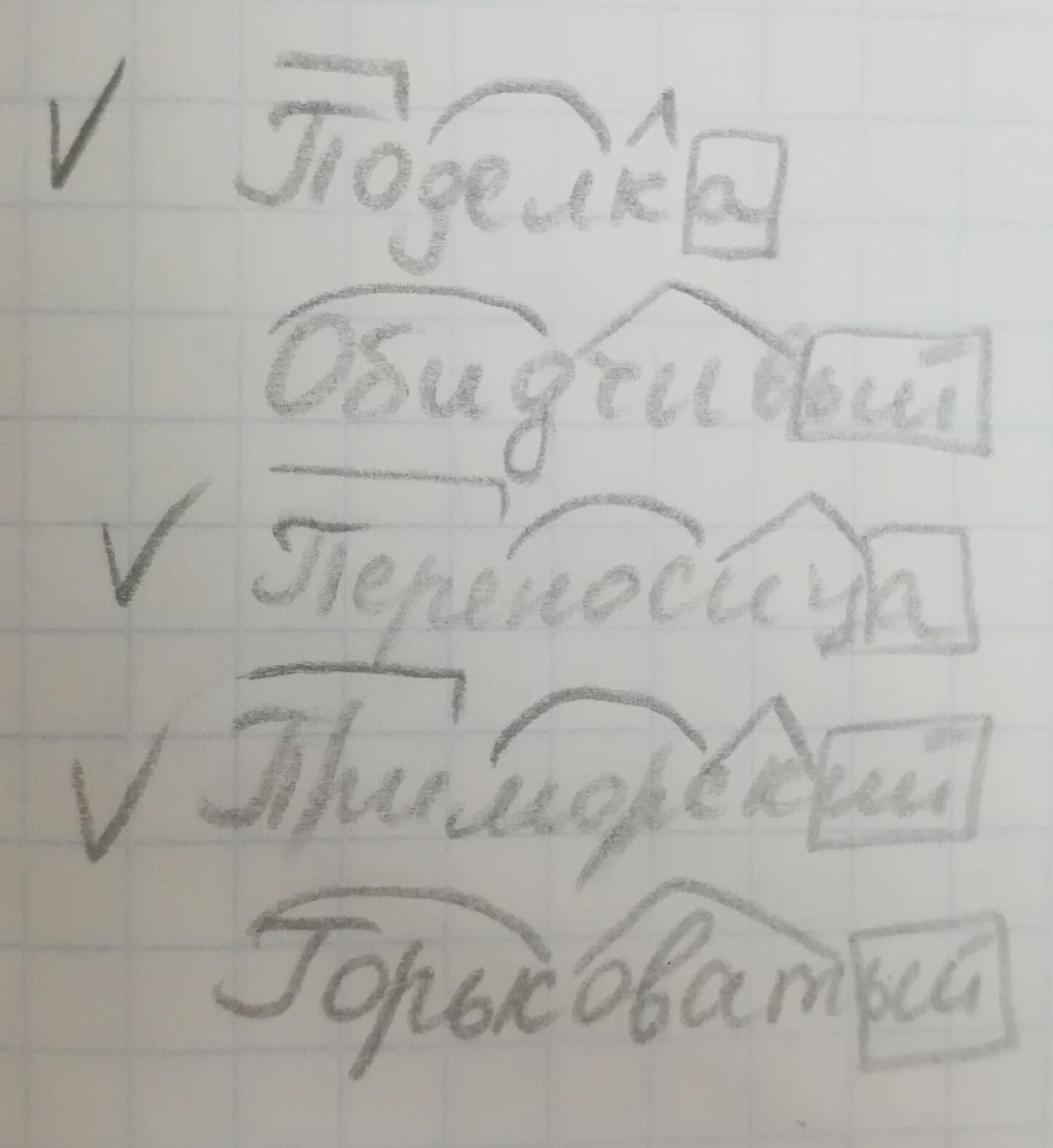 По/дел/к/а; обид/чив/ый; пере/нос/иц/а; при/мор/ск/ий;