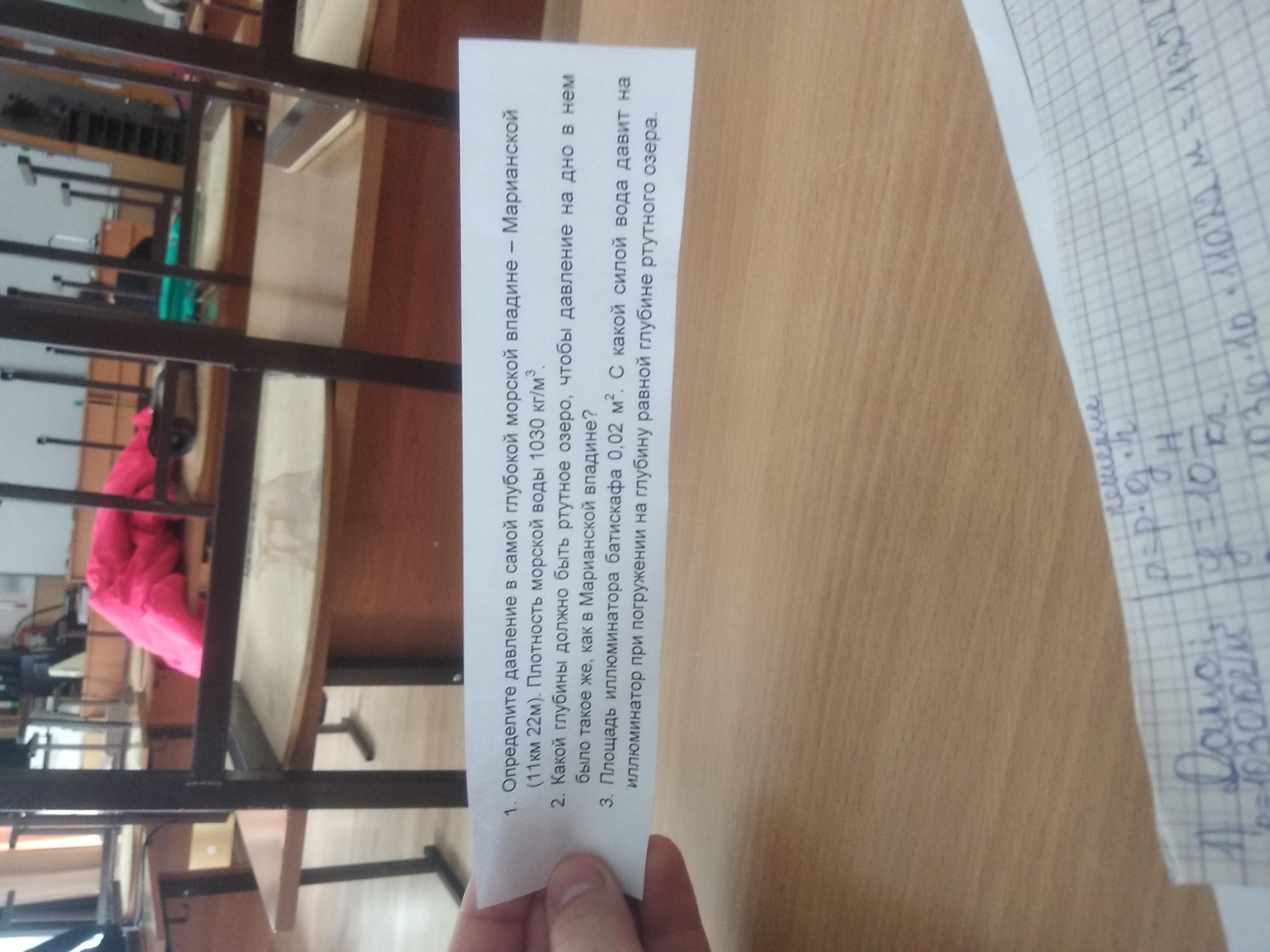 1) P=p*g*h=1030*10*11022=113,5*10^6 Па 2) h=P/p*g=113,5*10^6/136*10^3=830 м 3) F=p*g*h*S=1000*10*830*0,02=166*10^3 H