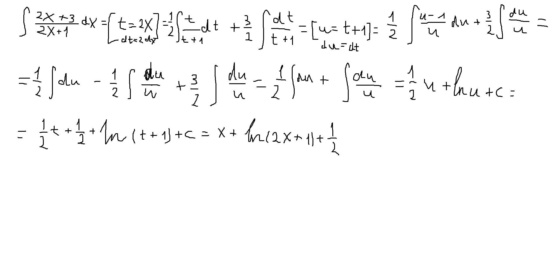 Основная ошибка, ИМХО, в выбранном методе (отсюда и замене, потеря "двойки" после прямой замены). Так как в числителе и знаменателе полиномы одинаковой степени ("неправильная дробь"), то необходимо либо делить полином числителя на полином знаменателя, либо разбивать на простые интегралы иным способом (например, тем, что предложен). Далее только после разбивания приступать к оценке и методам интегрирования.