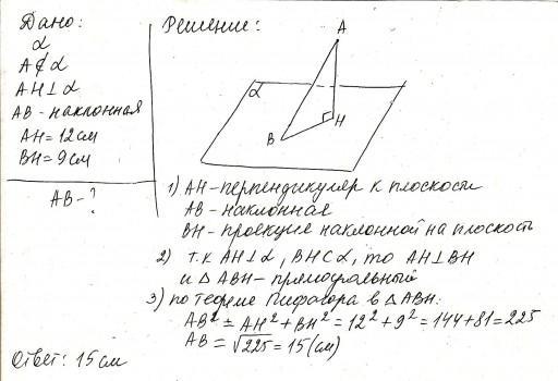 З точки до площини проведено перпендикуляр і похилу які дорівнюють 12см і 15см. Знайдіть проєкцію похилої