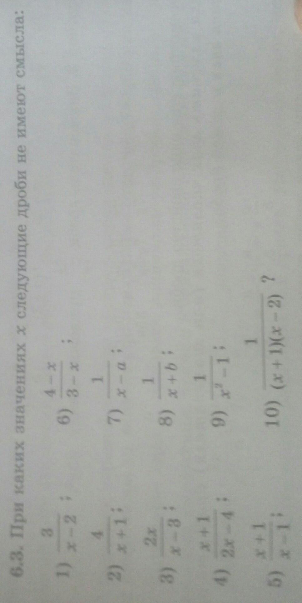 Дроби не имеют смысла, если в знаменатели стоит 0, поскольку на 0 делить нельзя, например, чтоб в "первом" в знаменатели получился 0 нужно весь знаменатель приравнять к нулю: x-2=0; x=0+2; x=2, значит при x=0 дробь не имеет смысла