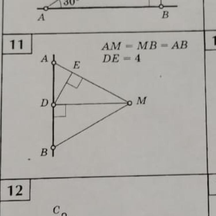По условию АМВ равносторонний, уАМД=30°, МД=2*ДЕ=8 -искомое расстояние