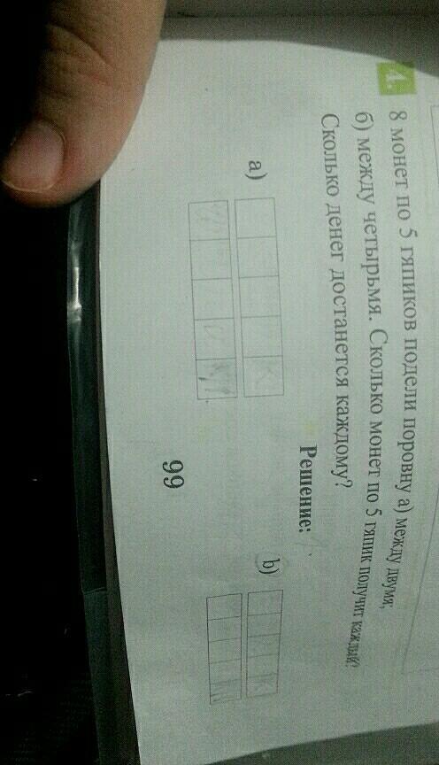 б)поскольку монет 8, а поделили между 4, то следует 8÷4=2