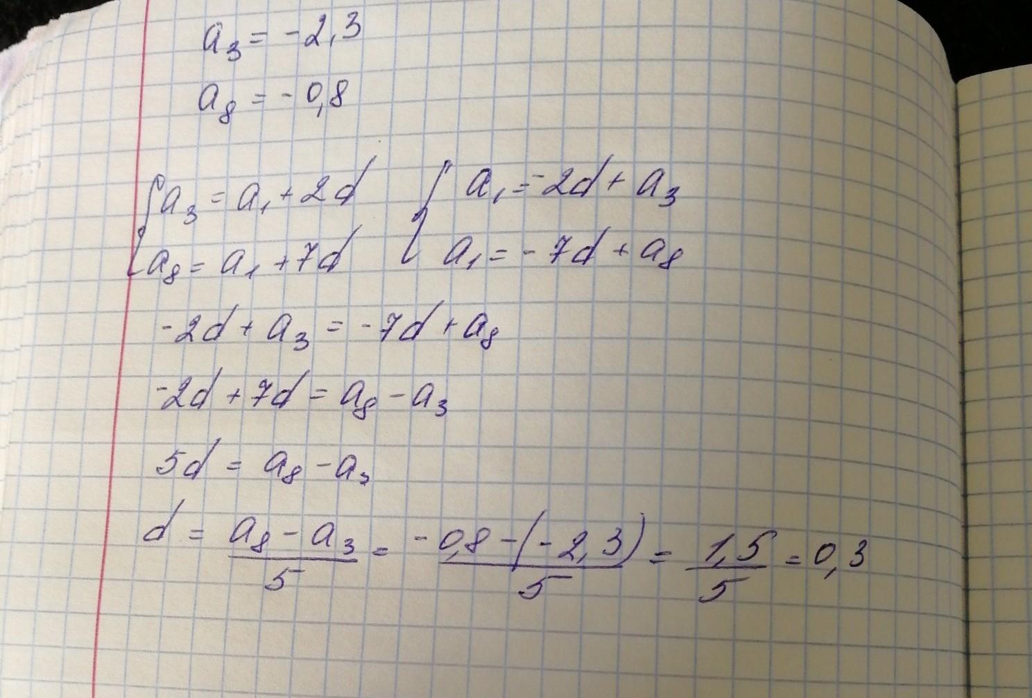 Помогите пожалуйста: найдите первый член и разность арифметической прогрессии (аn), если а3=-2,3; а8=-0,8