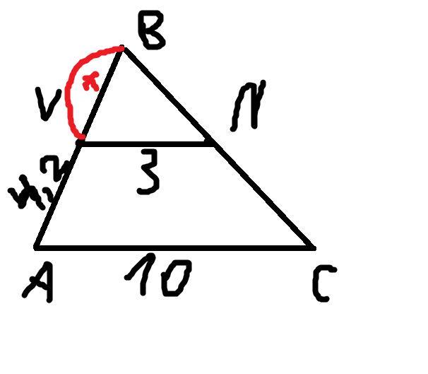 Треугольники ΔABC и ΔVBN подобны по равным углам (а они равны из параллельности прямых VN||AC), тогда если VB = x, то имеет место соотношение: 3 / 10 = x / (x+4,2), тогда: