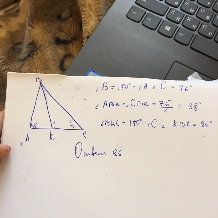 В треугольнике ABC проведена биссектриса BK. Найдите величину ушла CKB ,если угол BCA = 48 градусов, угол BCA = 56 градусов
