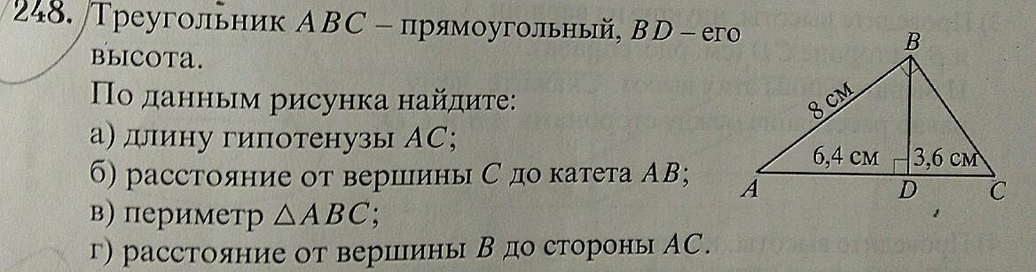 б) Расстояние между точкой и прямой это длина перпендикуляра, то есть это длина самого катета BC ведь угол между катетами 90°.