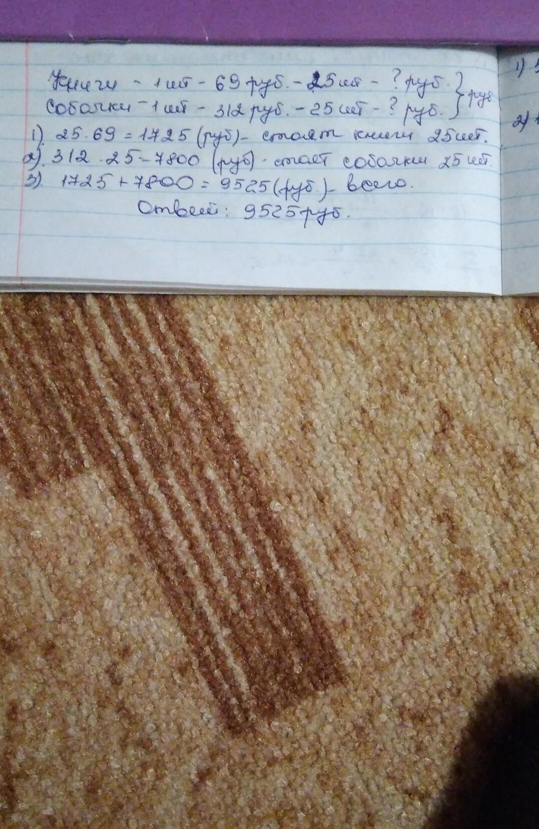 Для детского сада купили серию книг из 25 штук по цене 69 рублей за одну книгу и столько же плюшевых собачек по цене 312 рублей за одну собачку. Сколько рублей всё это стоит?