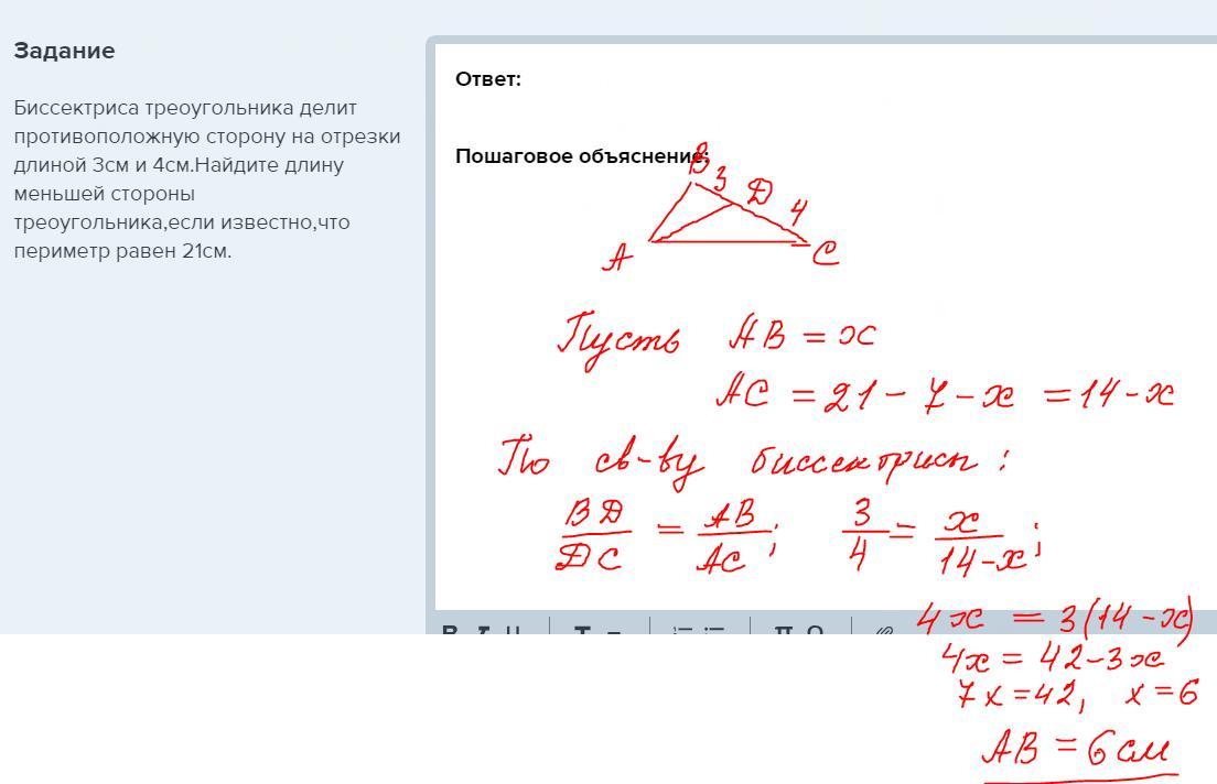 Биссектриса треоугольника делит противоположную сторону на отрезки длиной 3см и 4см.Найдите длину меньшей стороны треоугольника,если известно,что периметр равен 21см.