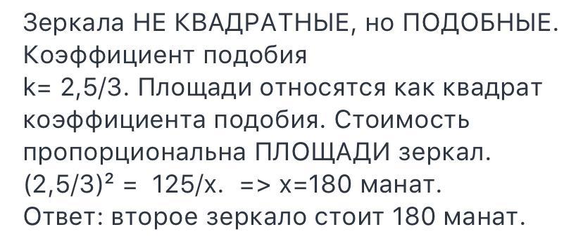 5) 9а/2,5 • 50/а = 180 манат - стоимость второго зеркала.