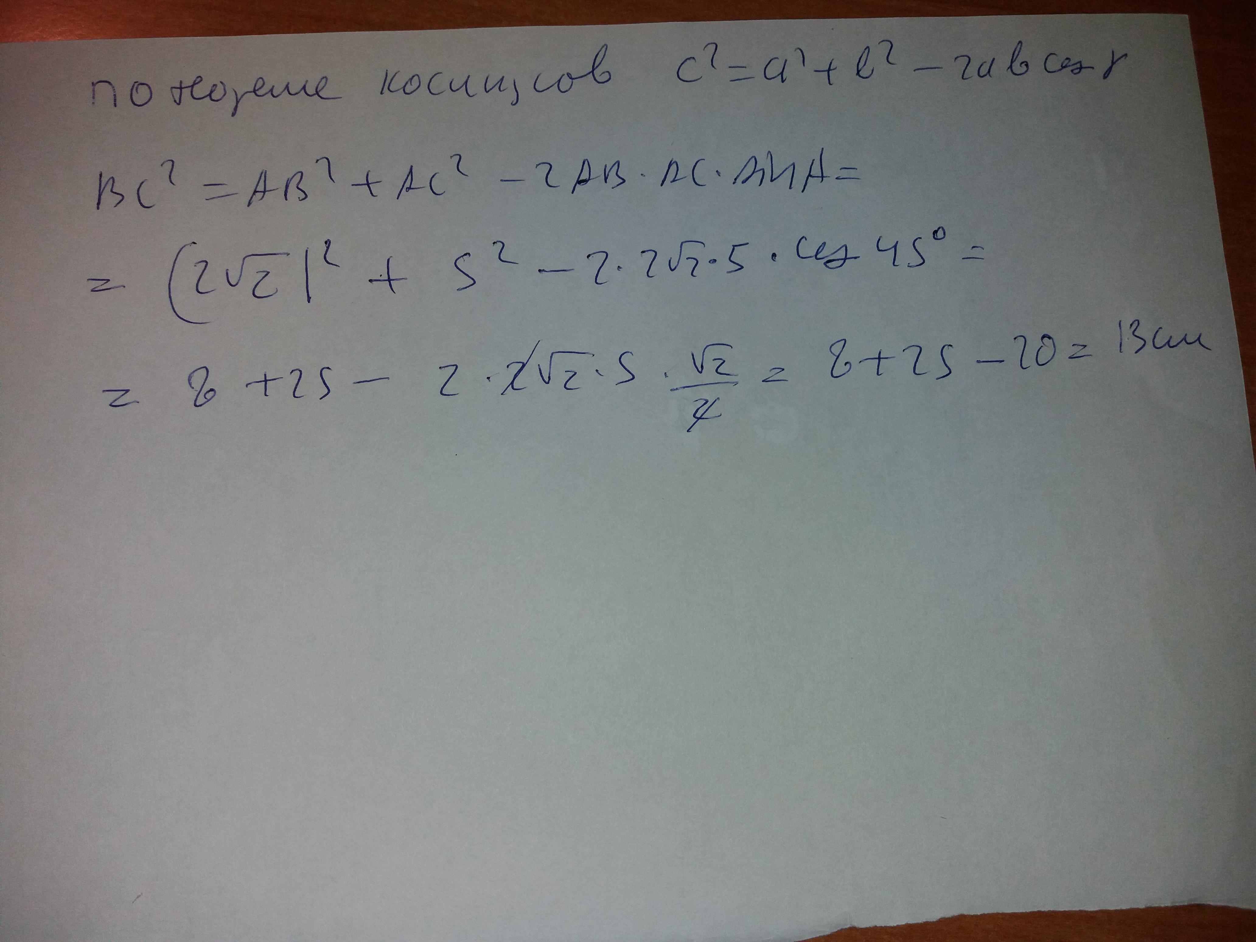 трикутнику авс АВ=2√2 см АС=5 см, кут А =45° см обчислити сторону ВС