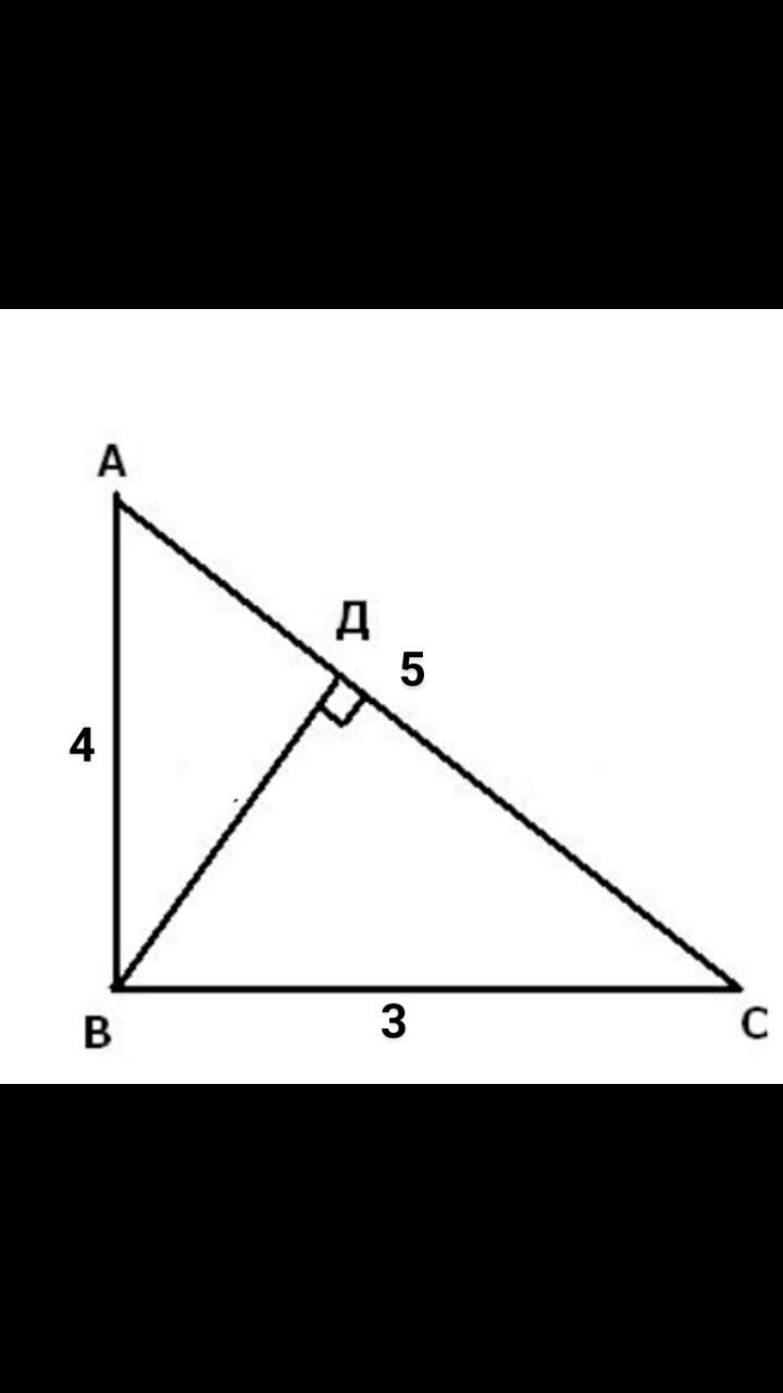 Длина высоты, проведенной к гипотенузе, равна отношению произведения катетов к гипотенузе. ВД=(АВ*ВС)/АС=4*3/5=12/5=2,4.....
