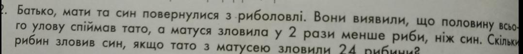 2б=б+м+с, с=2м, б+м=24; первое: б=м+с, сюда подставим: 24-м= м+2м, 4м=24, м=6 рибин матуся, с=2*6=12 рибин син -ответ