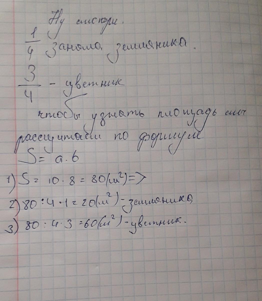 Четвертая часть участка длиной 10м,шириной 8 м,отведена под землянику,а остальная часть -под цветник.какая площадь занята цветником?