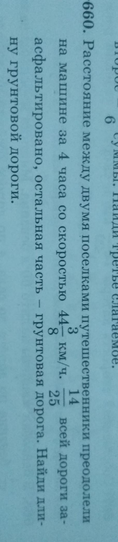 расстояние между двумя поселками путешественники преодолели за 4 часа со скоростью 44 целых 3 восьмых км/ч. 14 двадцать пятых всей дороги заасфальтированно, остальная часть - грунтовая дорога. найди длину грунтовой дороги.