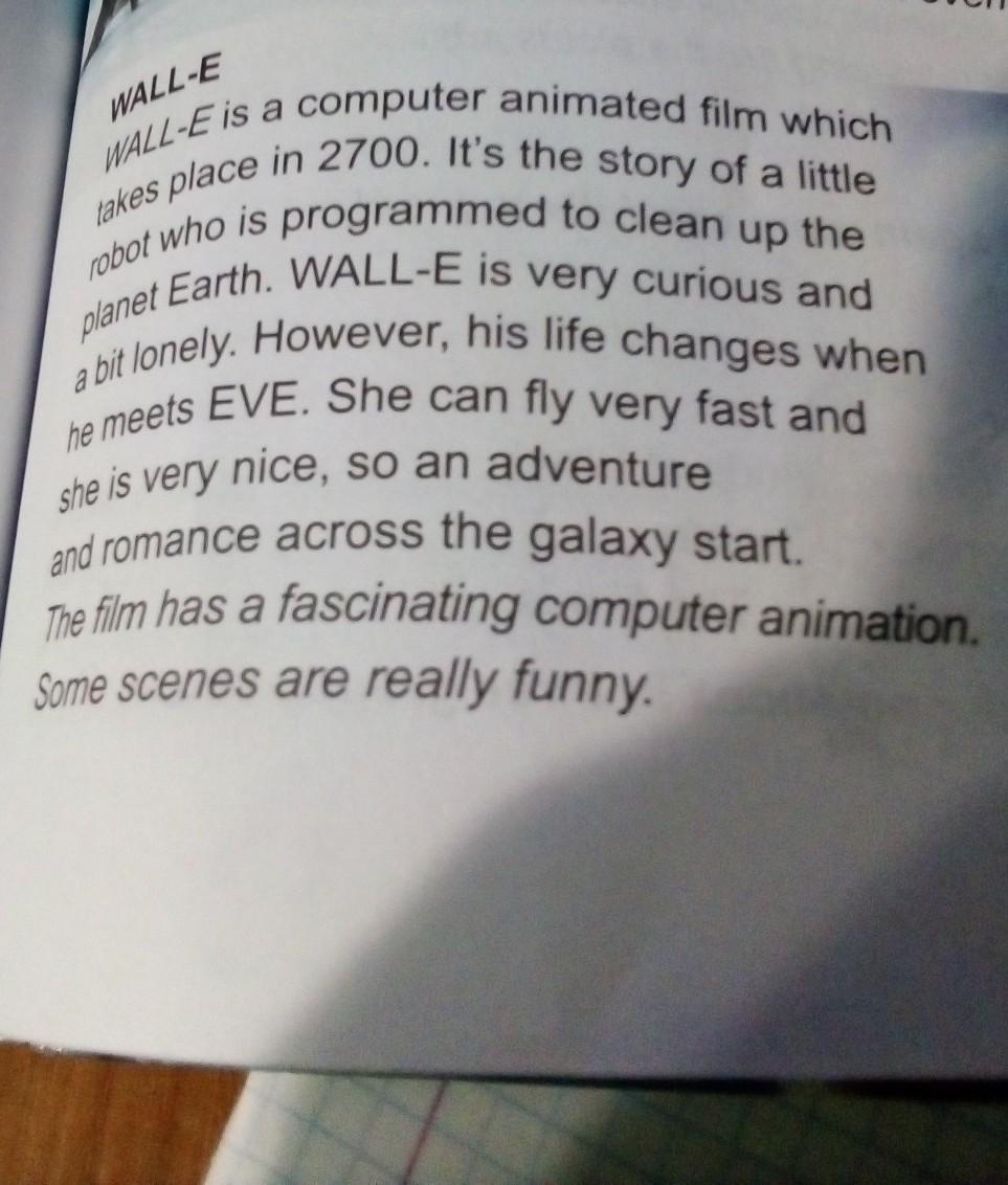 Валли это анимированный на компьютере фильм который занял 2700 место. это история маленького робота, который запраграмиривонан чистить планету Земля. но Валли очень любопытный и одинокий. тем не менее, его жизнь изменяется, когда он встречает ЕВЕ. она может летать быстро и она очень прекрасная., и поэтому у него возникает приключение и романтика в галактике. этот фильм имеет увлекателеную анимацию. некоторые сцены очень смешные.
