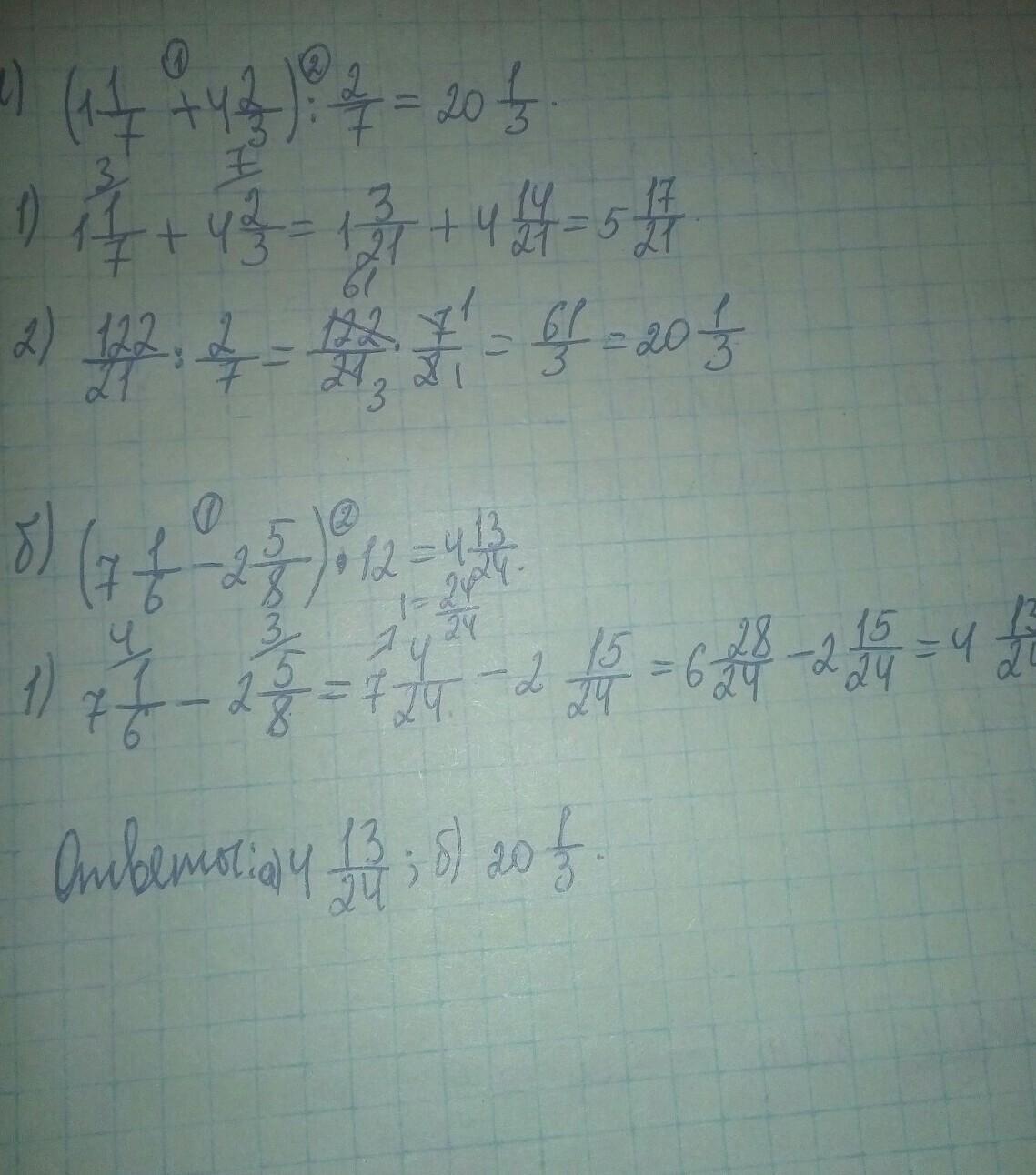 a)(1 1/7 + 4 2/3): 2/7;б)(7 1/6 - 2 5/8) * 12.