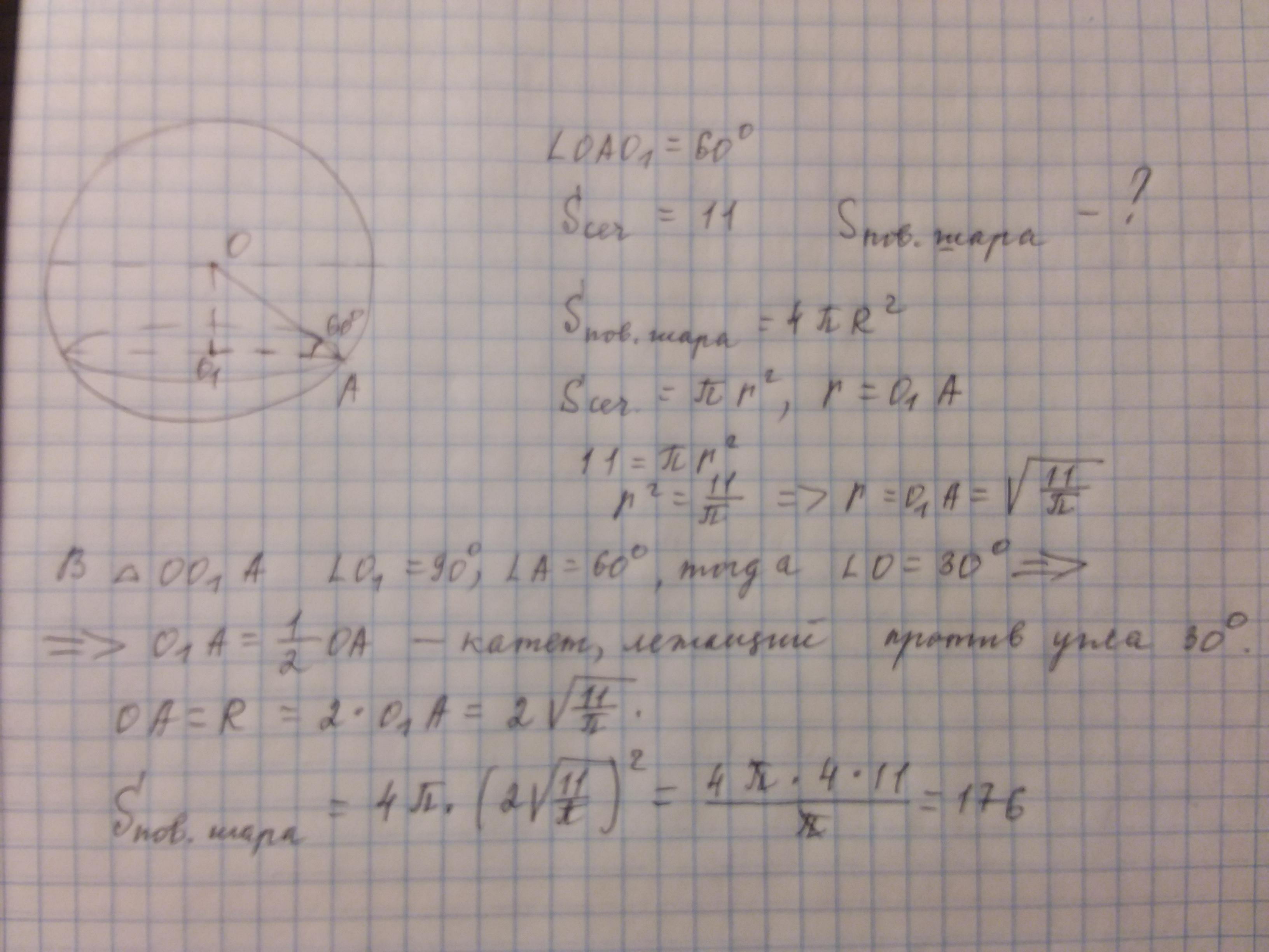 Через конец радиуса шара проведена плоскость под углом 60° к нему. Площадь полученного сечения равна 11. Найдите площадь поверхности с шара (с рисунком).