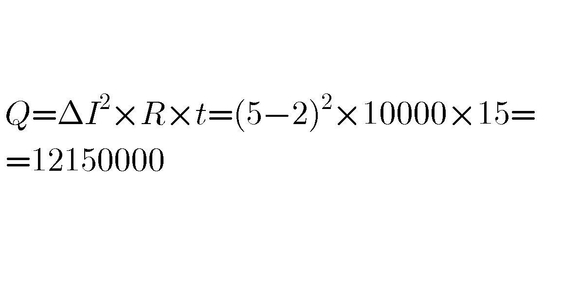 Q=(I2-I1)^2×R×t=(5-2)^2*10000×15=1215000Дж= 1.215 МДж