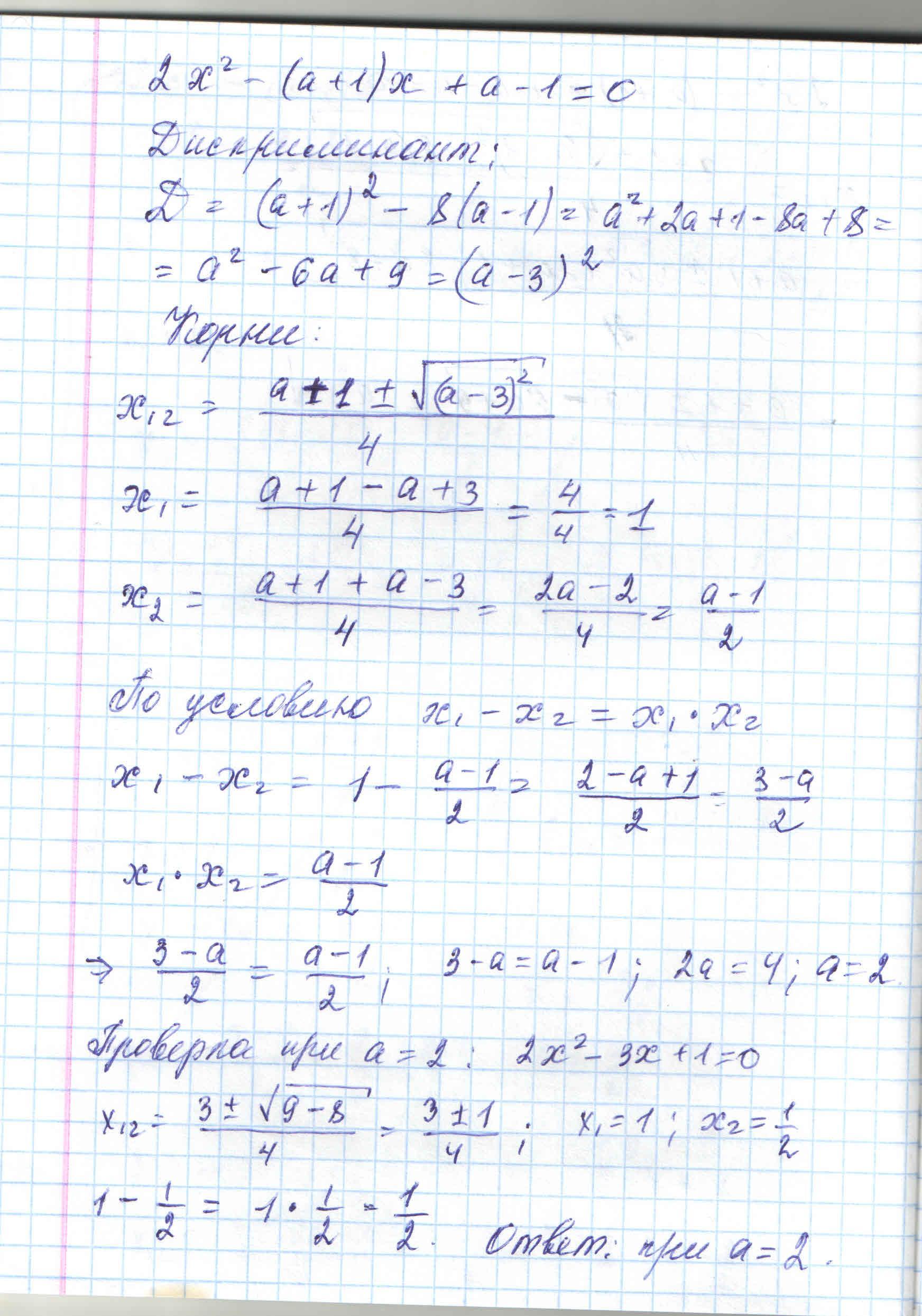 При каких значениях параметра a разность корней уравнения 2x^2-a(x+1)+a-1=0 равна их произведению?
