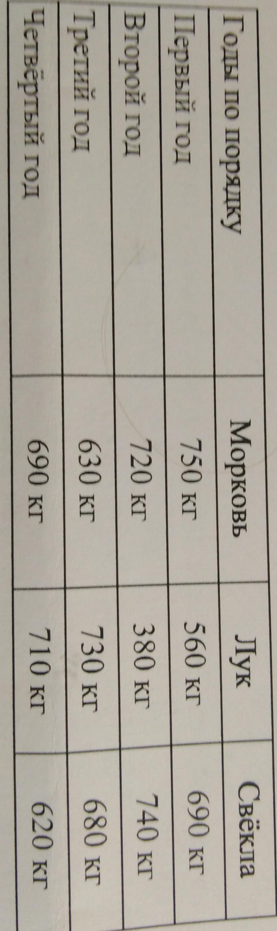 Пётр Иванович выращивает морковь, лук и свеклу. Каждый овощ он выращивал на отдельном участке в течении четырёх лет. Пётр Иванович заносит в таблицу количество килограммов урожая, которое он получает с каждого участка за год. Используя таблицу(ниже), ответьте на вопрос: "СКОЛЬКО КИЛОГРАММОВ ЛУКА ПОЛУЧИЛ ПЁТР ИВАНОВИЧ ЗА ВСЕ ЧЕТЫРЕ ГОДА?"