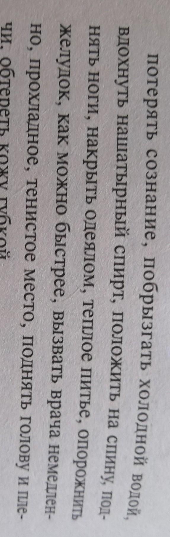 to lose consciousness, to sprinkle cold water, to inhale ammonia, to put on the back, to lift legs, to cover with a blanket, the warm drinking, to empty the stomach, as fast as possible, to call the doctor immediately, cool, shady place, to lift head and shoulders, to sponge the skin.