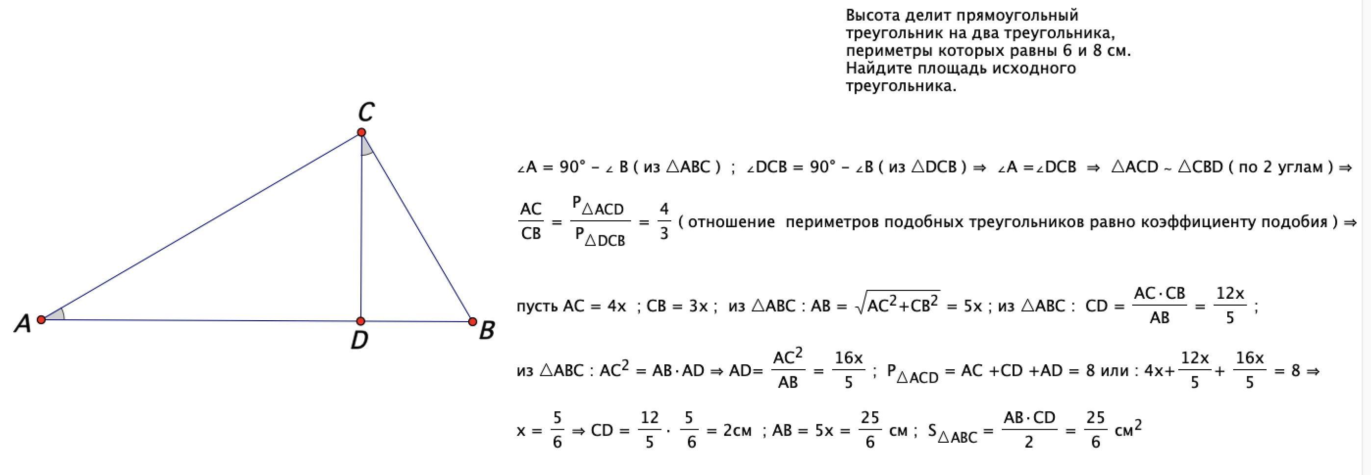 Высота делит прямоугольный треугольник на два треугольника, периметры которых равны 6 и 8 см. Найдите площадь исходного треугольника.