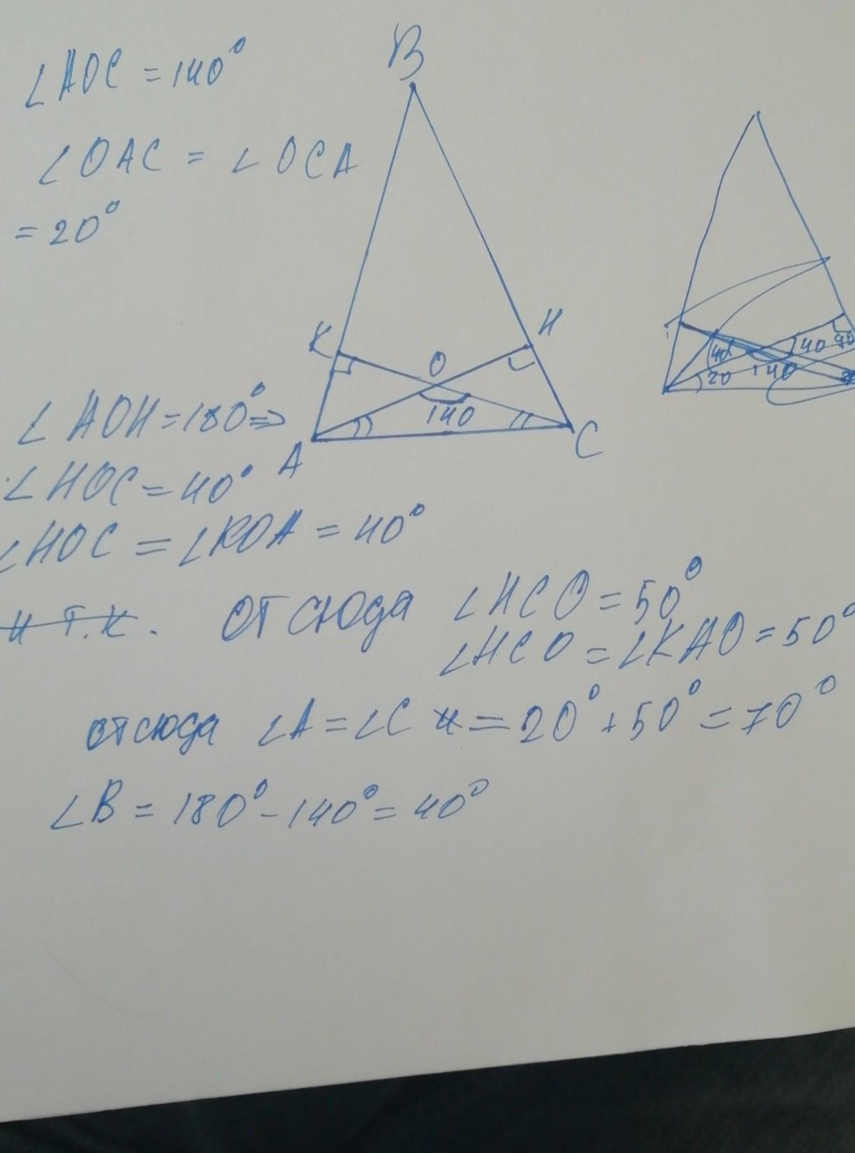 высоты равнобедренного треугольника проведенные из вершин при основании пересечении образуют угол равный 140°. Найдите углы треугольника