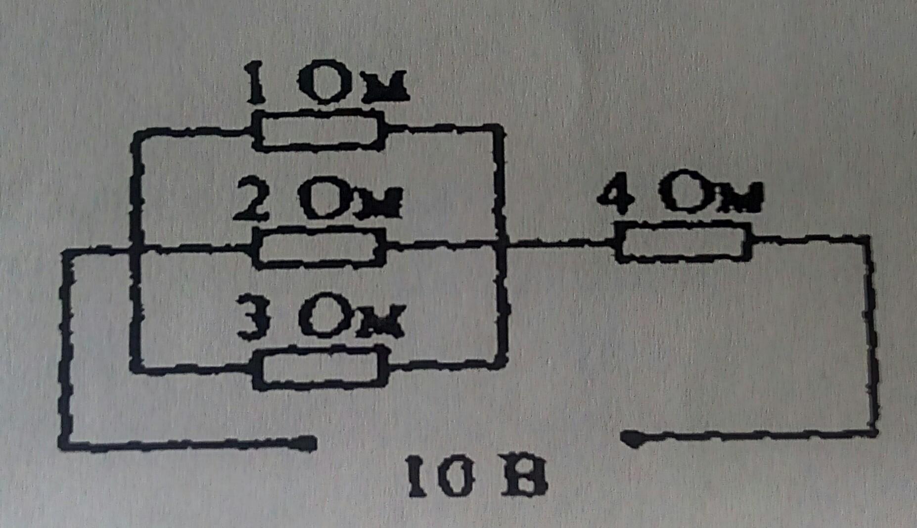 На участке электрической цепи, содержащем три параллельно соединённых резистора и один последовательно (смотрите рисунок), электрическое напряжение 10В. Электрическое сопротивление резистора 1,2,3 и 4 Ома. Какая мощность выделяется на резисторе в 4 Ома?
