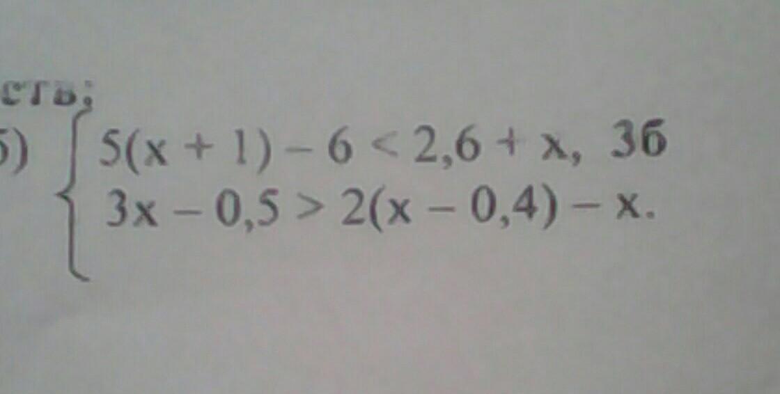 left { {{5(x+1)-6<2,6+x} atop {3x-0,5>2(x-0,4)-x}} right.\\left { {{5x+5-6<2,6+x} atop {3x-0,5>2x-0,8-x}} right.\\left { {{5x-x<2,6+1} atop {3x-x>0,5-0,8}} right. \\left { {{4x<3,6} atop {2x>-0,3}} right.\\left { {{x<0,9} atop {x>-0,15}} right.\\xin(-0,15;0,9)