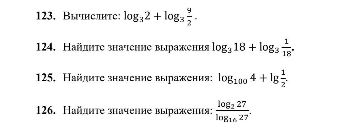 123)log_{3}2+log_{3}frac{9}{2}=log_{3}(2*frac{9}{2})=log_{3}9=log_{3}3^{2}=2log_{3} 3=2*1=2\\124)log_{3}18+log_{3}frac{1}{18}=log_{3}(18*frac{1}{18})=log_{3}1=0\\125)log_{100}4+lgfrac{1}{2} =lg2+lgfrac{1}{2}=lg(2*frac{1}{2})=lg1=0