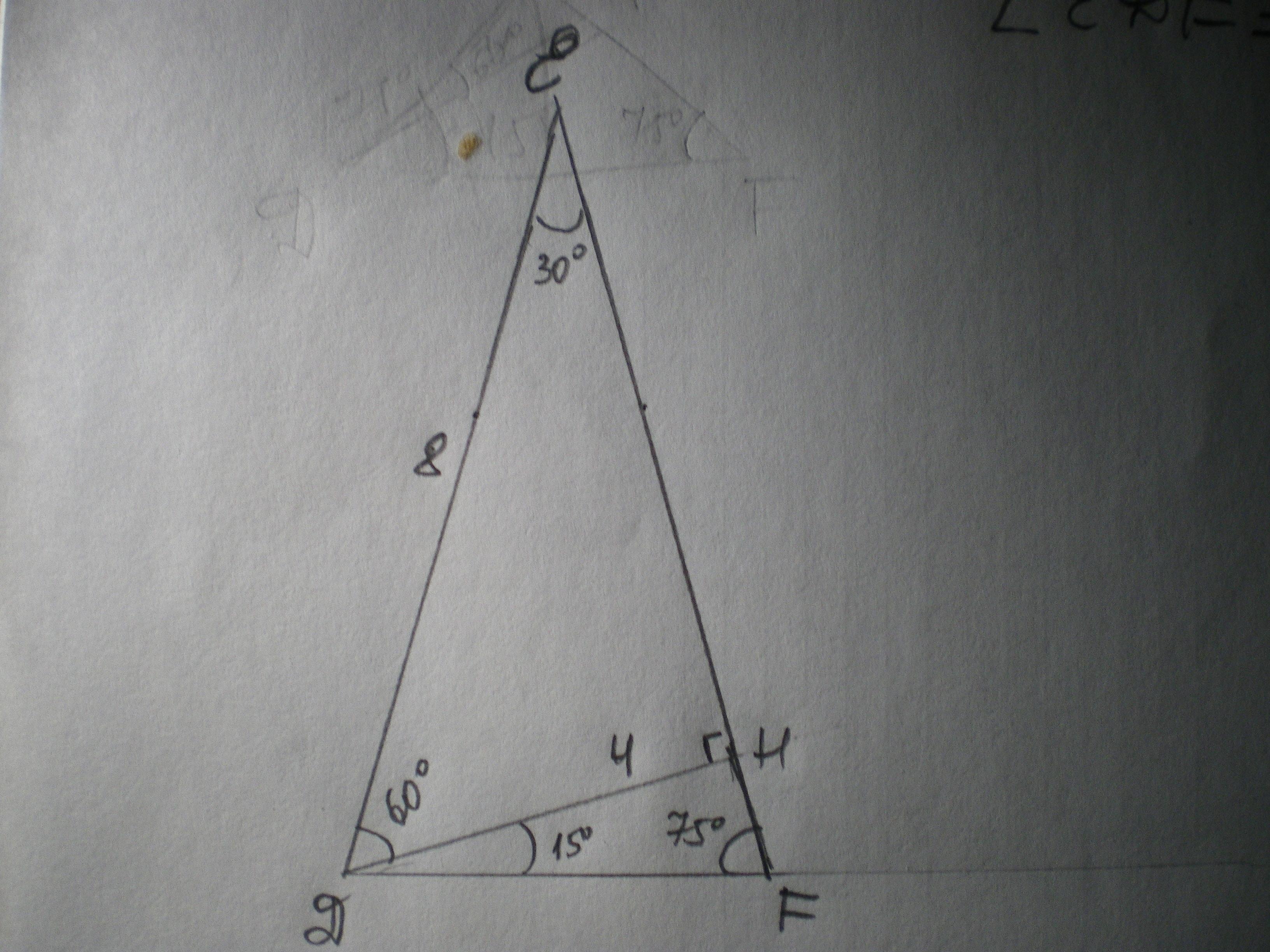 Все легко, только не просите рисовать. Вот сначала разберемся с углами. т.к. ДН- высота, то ДНF=ДНЕ=90°, Т.к. ∠НДF =15°, в ΔНДF, то ∠НFД =75°, тогда и ∠ЕДF=75° как углы при основании равнобедренного ΔДЕF. Но тогда в ΔДЕН ∠ Н равен 90°, ∠ ЕДН=75°-15°=60°, и на долю ∠ДЕН приходится 30°. Значит, катет ДН =4 см в два раза меньше гипотенузы ДЕ, т.е. 8см.