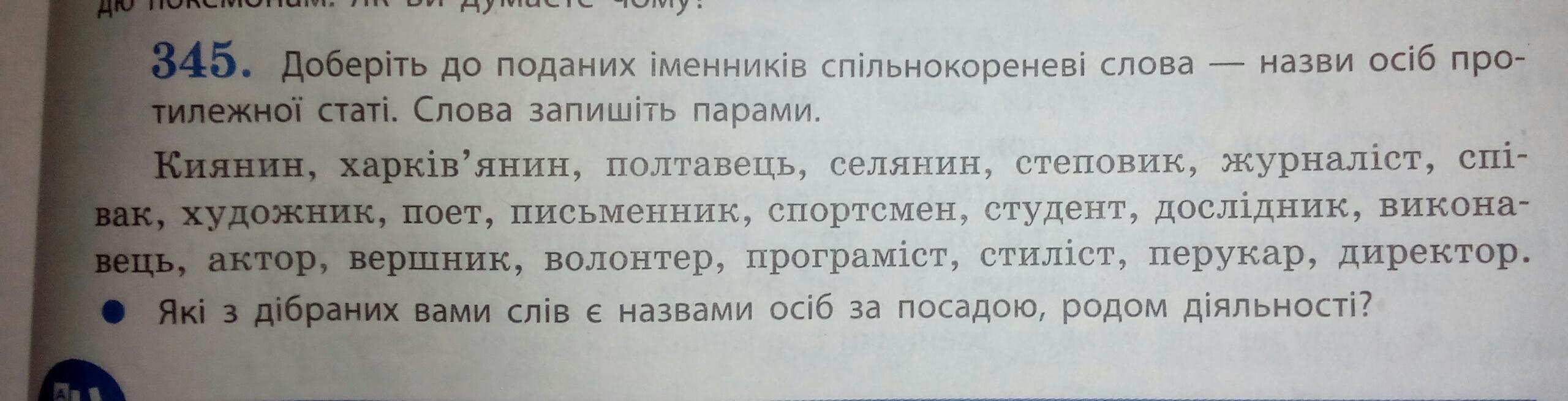 Киянин- киянка, харків'янин - харків'янка, полтавець - полтавка, селянин - селянка, степовик - степовичка, журналіст - журналістка, співак - співачка, художник - художниця, поет - поетка, поетеса, письменник - письменниця, спортсмен - спортсменка, студент - студентка, дослідник - дослідниця, виконавець - виконавиця, актор - акторка, вершник - вершниця, волонтер - волонтерка, програміст - програмістка, стиліст - стилістка, перукар – перукарка, директор - директорка.