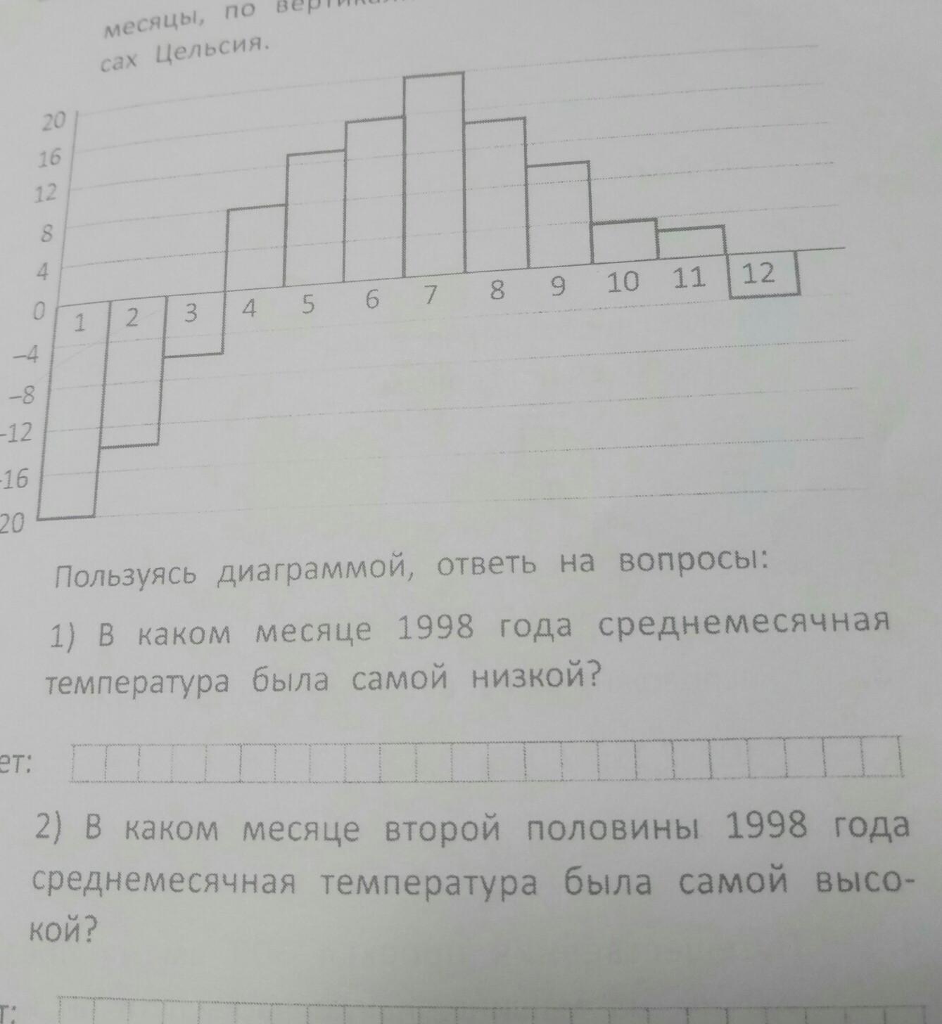 На диаграмме показано средимесячная температура воздуха в Екатеринбурге за каждый месяц 1998 года. По горизонтали указываются месяцы, по вертикали - температура в градусах Цельсия